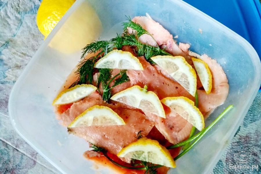 4. Сверху выкладываем лимон, укроп. Поливаем растительным маслом без запаха. Убираем рыбу в холодильник минимум на 2 часа. В идеале - на ночь.