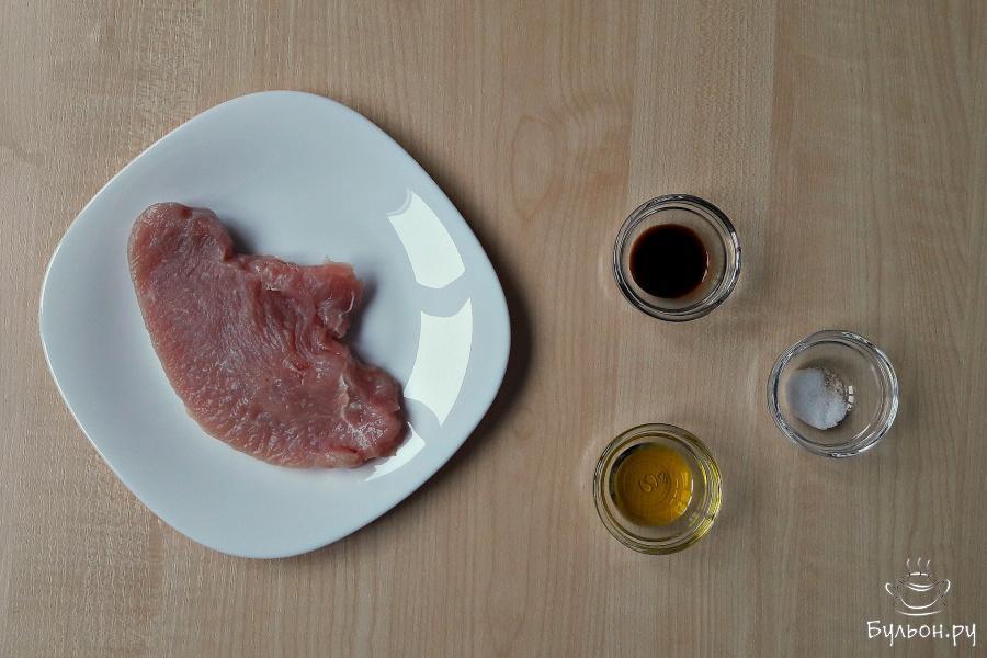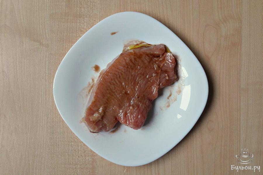2. Поливаем с обеих сторон индейку бальзамическим уксусом и оливковым маслом, солим, и отставляем в сторону минут на 15. За это время мясо хорошо промаринуется.