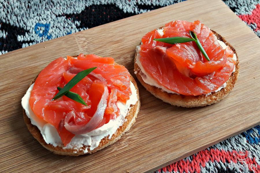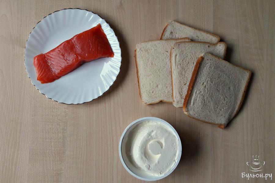 1. Для приготовления тостов нам понадобится хлеб (лучше тостовый), соленая форель, сыр рикотта и перышко зеленого лука.