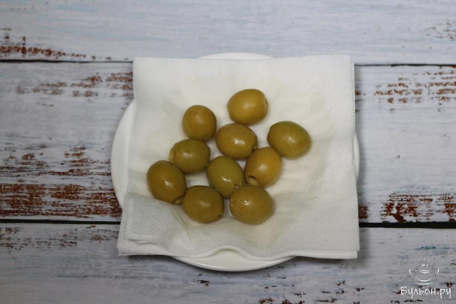 2. Во втором шаге перейдем к оливкам. Тут все просто. Вскрываем банку, из рассола достаем оливки и выкладываем их на рабочую поверхность, доску или тарелку. Главное, сверху положить несколько салфеток. Вот на них и выкладываем оливки. Салфетки вберут в себя остатки рассола.