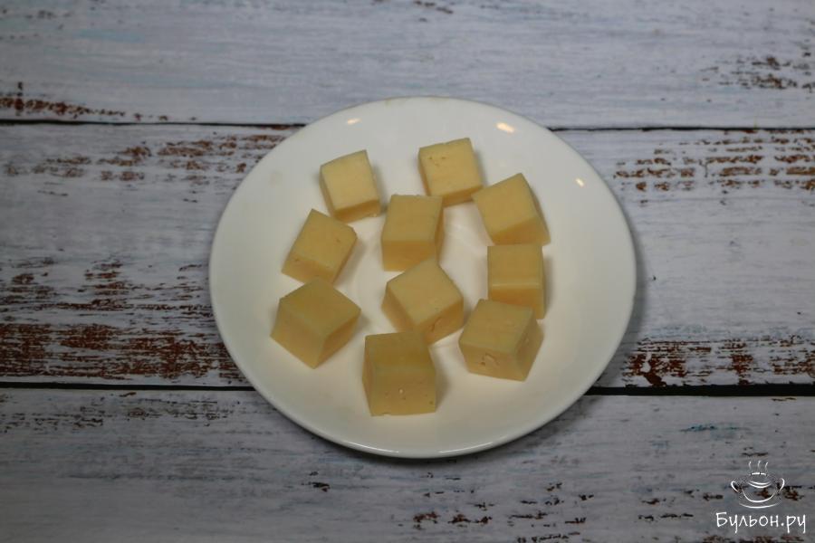 1. Сыр режем на кубики. Один кубик равен 1,5 см. х 1,5 см. При желании можно приложить линейку к сыру и тем самым отрезать необходимый по размеру кусочек. Либо можно сделать это на глаз, но тогда, скорее всего кубики получаться примерно одинакового размера, но все равно будут отличаться друг от друга.