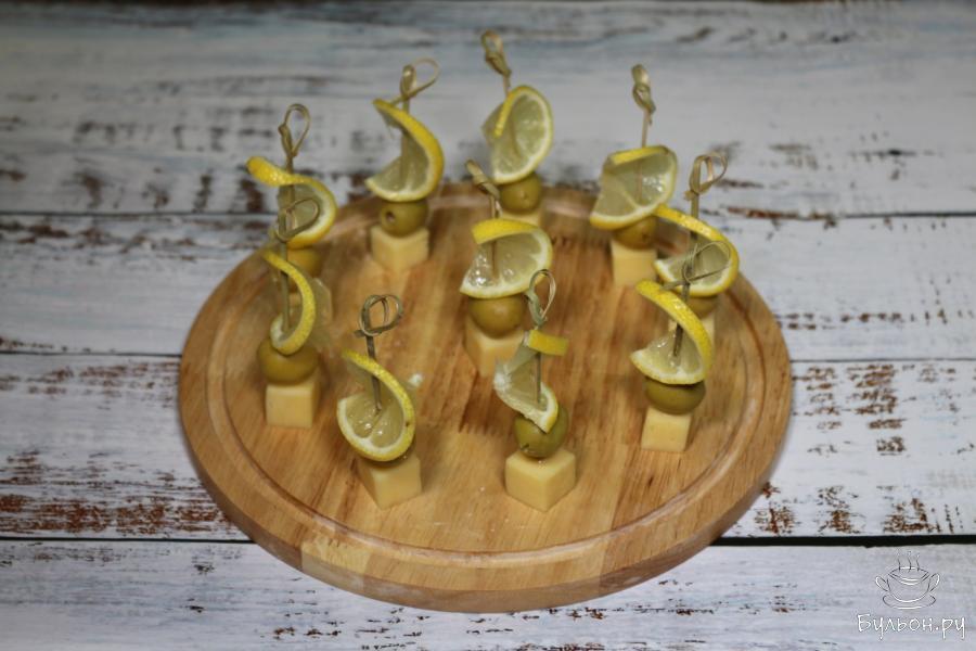 5. Далее на шпажку насаживаем оливку, затем кубик сыра. Первая канапешка готова. Приступаем к сборке остальных. Как только все канапе собраны, устанавливаем их на блюдо и подаем к... Ну к чему подаем, я думаю, вы уже догадались.