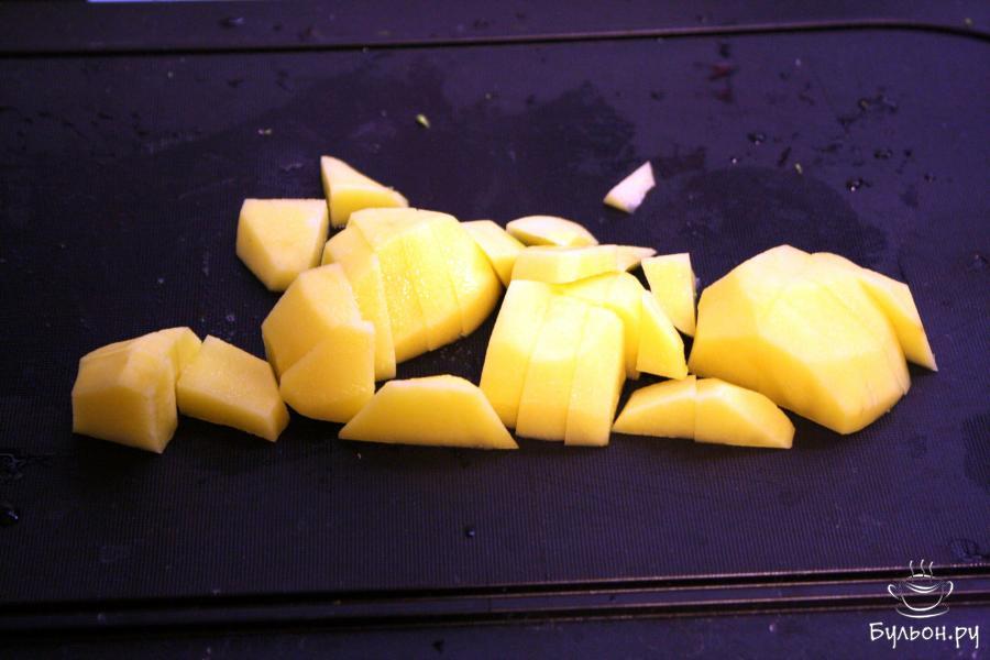 2. Картофель очистить, порезать мелкими кубиками. Бросить в кастрюлю с кипящей водой, варить 10 минут.