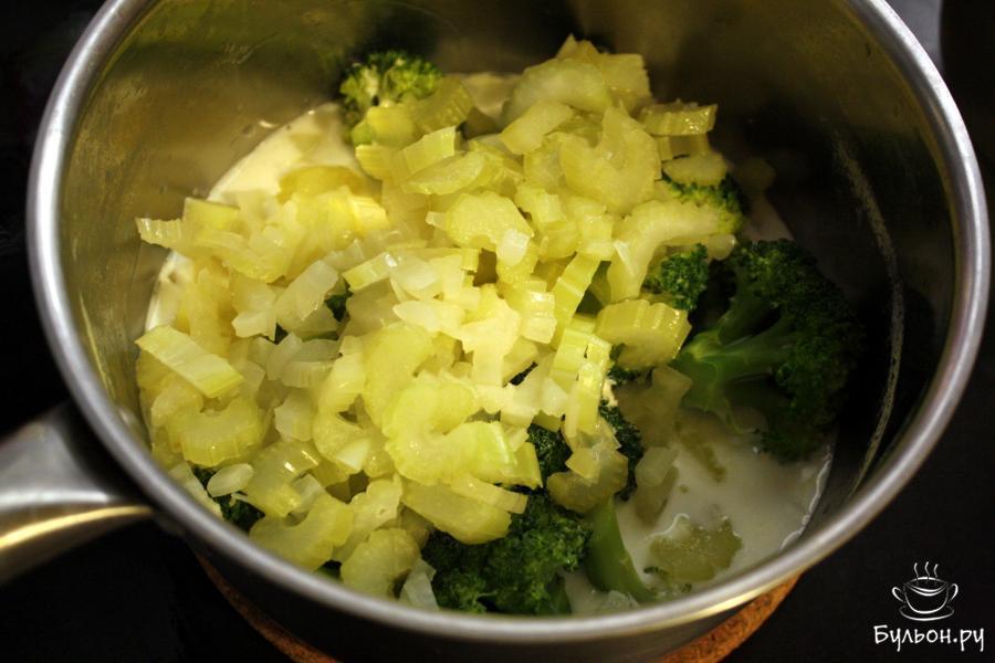 1. Лук и сельдерей очистить и мелко порезать. Спассеровать до мягкости на сливочном масле с добавлением горячей воды.