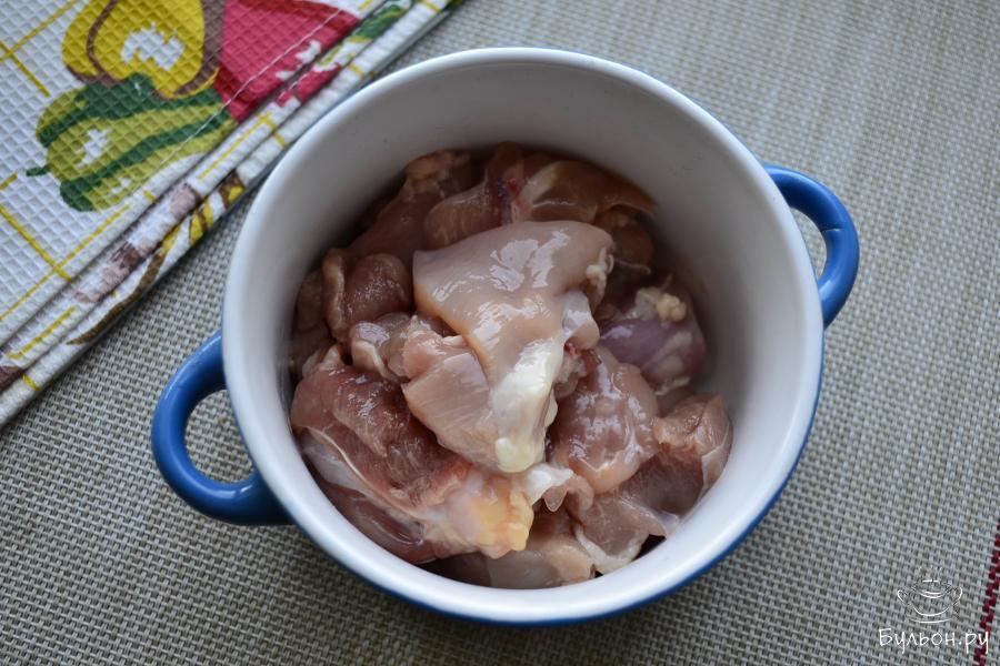 1. Любые части курицы без кости (у меня обрезанное мясо с бедрышек) порезать средними кусочками, поместить в подходящую для СВЧ кастрюльку или миску.