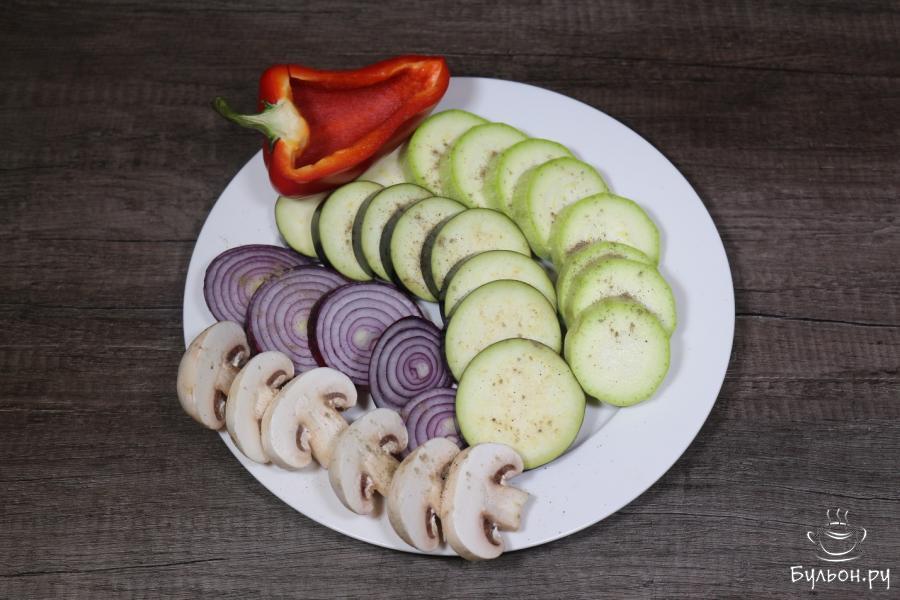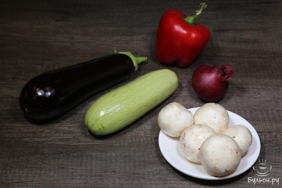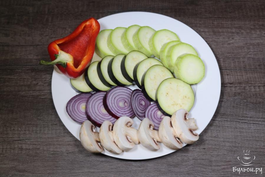 2. Нарезаем овощи по своему желанию, но не слишком мелко. Как вариант, кабачок, баклажан и лук можно нарезать кольцами толщиной до 1 см. Перец можно нарезать крупными кусочками квадратной или прямоугольной формы, или разрезать его пополам. Шампиньоны лучше всего нарезать пластинами.