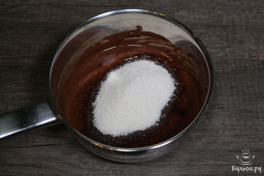 3. Далее добавляем сахарный песок, продолжаем варить сироп и не забываем его помешивать. Массу из какао, воды и сахара доводим до кипения.
