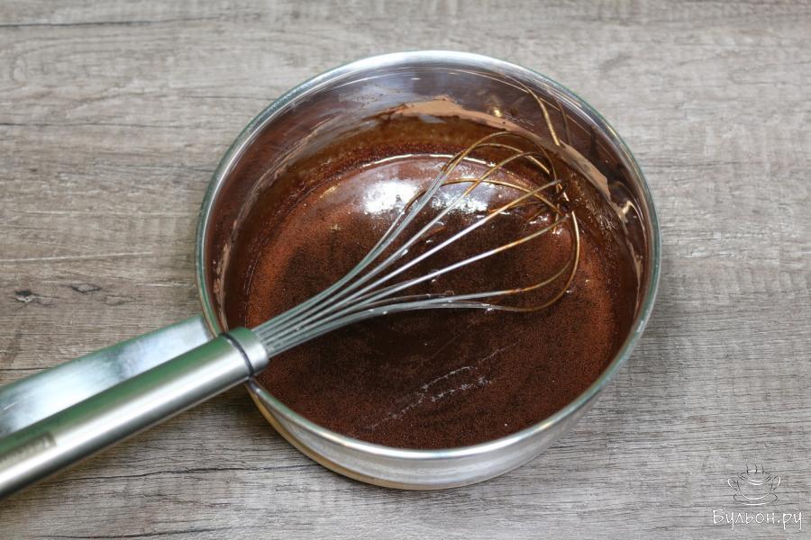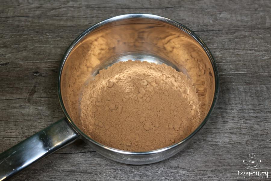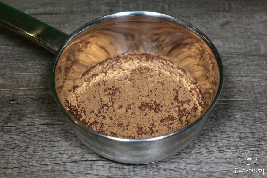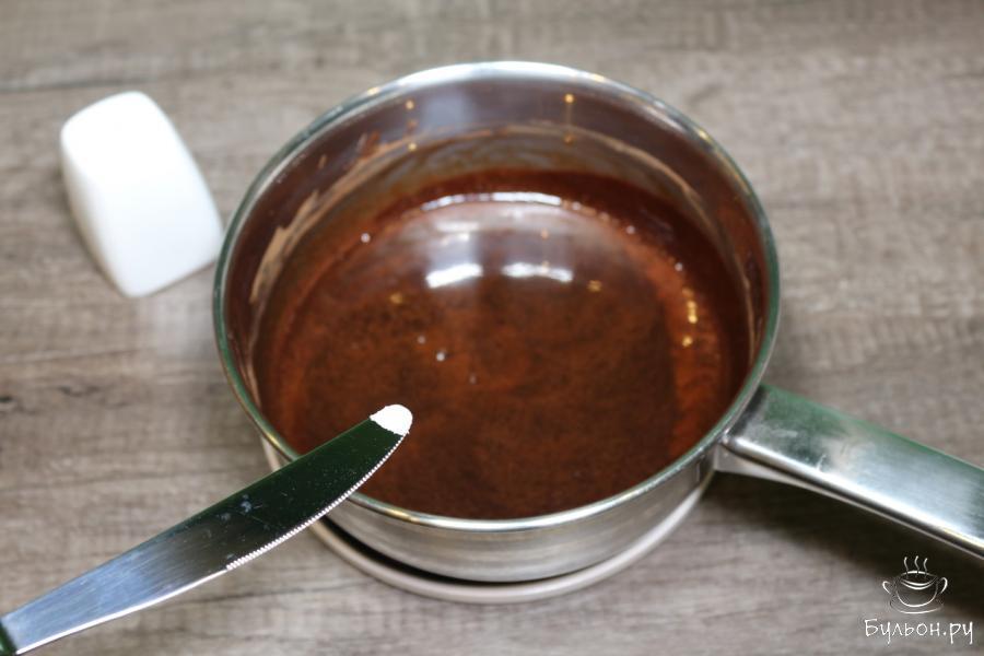 2. Теперь ковш с какао и водой ставим на огонь. Он должен быть средним. Постоянно помешиваем ингредиенты так, чтобы какао-порошок полностью растворился.