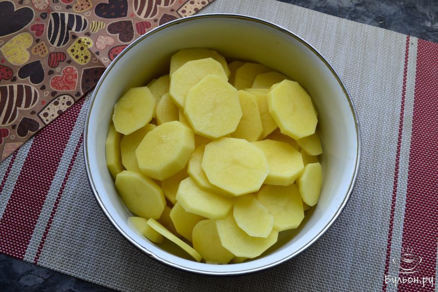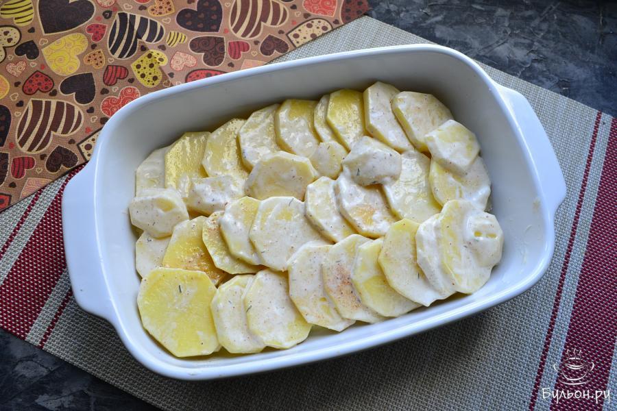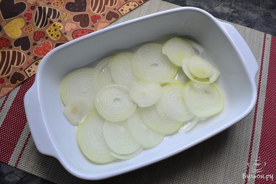 6. Любую подходящую форму смазать растительным маслом. Лук порезать кольцами и выложить его первым слоем внахлест на дно формы.