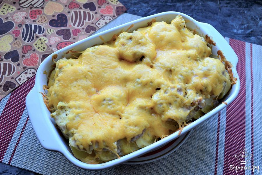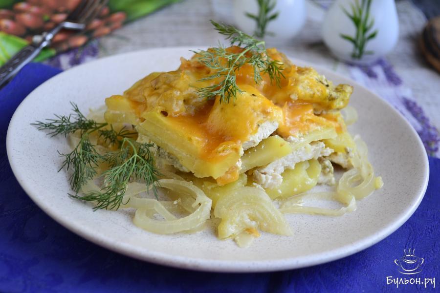 Для обеда или ужина попробуйте приготовить запеканку с курицей, картошкой и сыром, которая получается необычайно вкусной. Я решила слишком не измельчать продукты, чтобы все слои в запеканке были видны и ощущались по вкусу. Чтобы картошка и мясо были мягкими и нежными, я вначале блюдо накрыла фольгой, а затем, ее убрала для образования сверху румяной корочки из сыра. Попробуйте и вы эту замечательную запеканку, вам она понравится однозначно, ведь здесь беспроигрышное сочетание продуктов. Очень просто все и очень вкусно. Подать запеканку можно с о свежими овощами или соленьями.