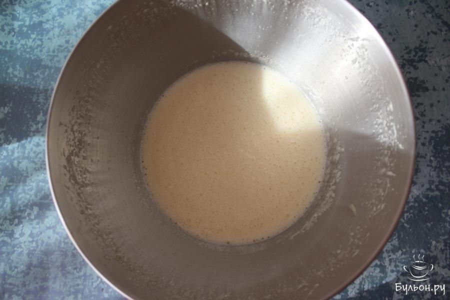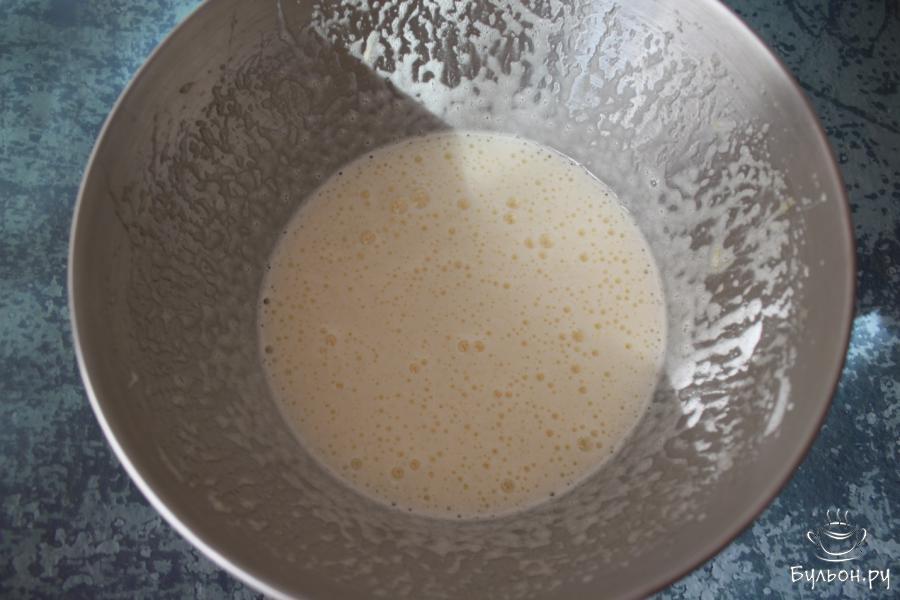 3. Когда масло подостынет, перелейте его в сладкую яичную массу, влейте молоко, добавьте щепотку соли и ванильный сахар. Снова взбейте, затратив на это буквально 1 минуту.