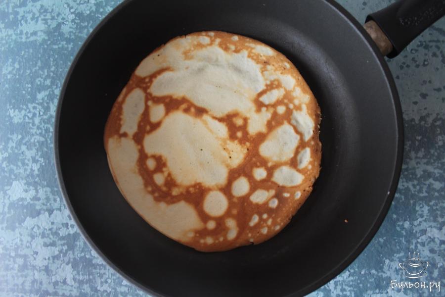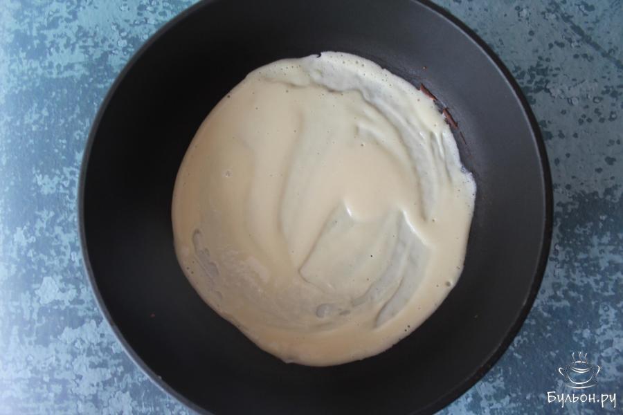 5. В центр разогретой сковороды выложите 1,5 столовые ложки теста и, действуя достаточно быстро, распределите тесто по диаметру сковороды при помощи специальной палочки либо же, используя подручные средства, например, ложку.
