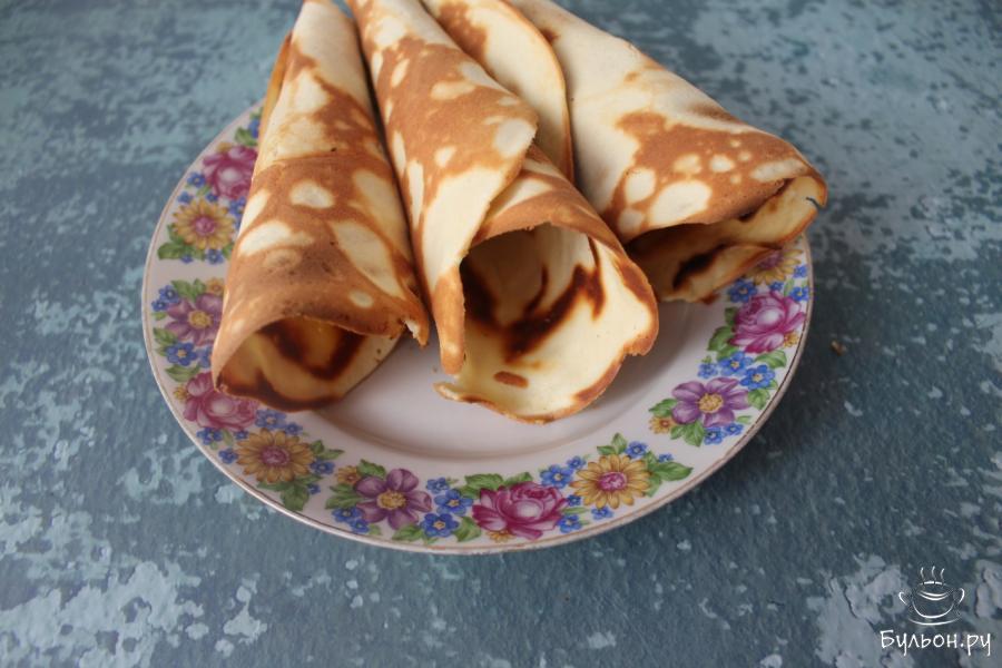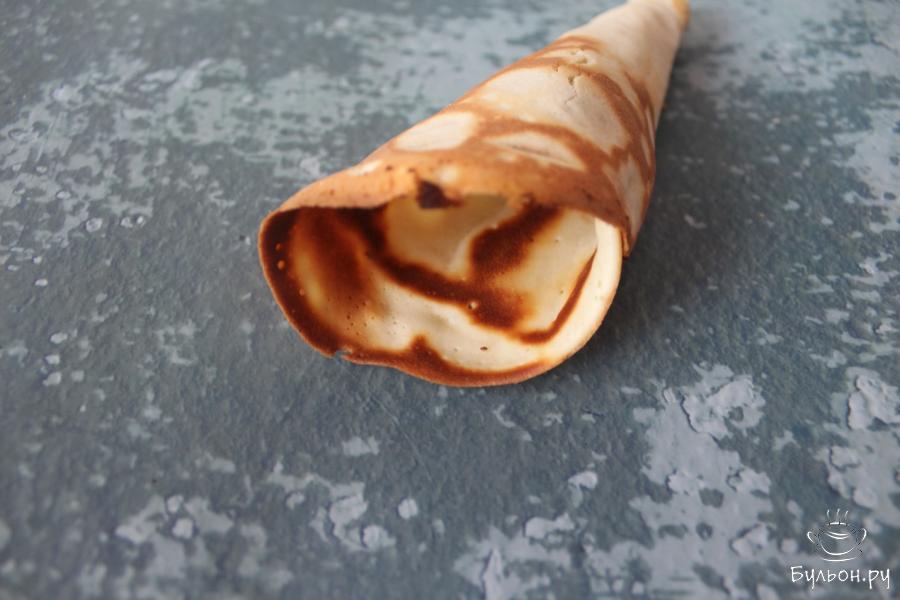 7. Снимите вафлю со сковороды и очень быстро заверните. Упустив буквально 20-30 секунд, вафлю вы уже потом не свернете, она у вас просто поломается.