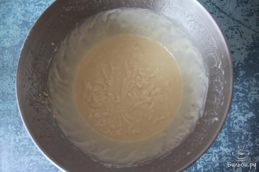 4. Введите в тесто муку, просеивая ее через сито. Продолжайте взбивать тесто еще в течение 2-3 минут.