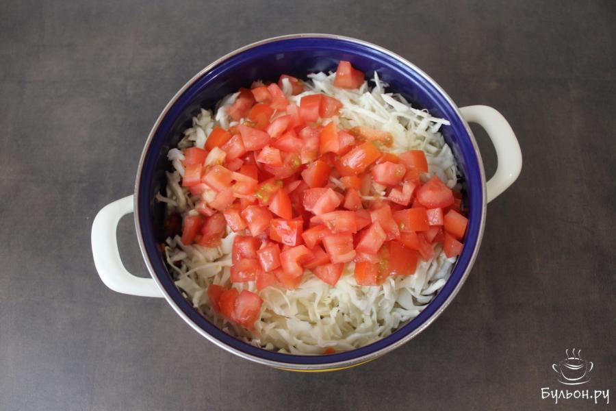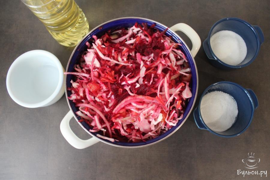 5. Добавляем соль, сахар, растительное масло и воду. Ставим кастрюлю на огонь. После того, как закипит вода, закрываем кастрюлю крышкой и тушим овощи в течение 20 минут, иногда помешивая.