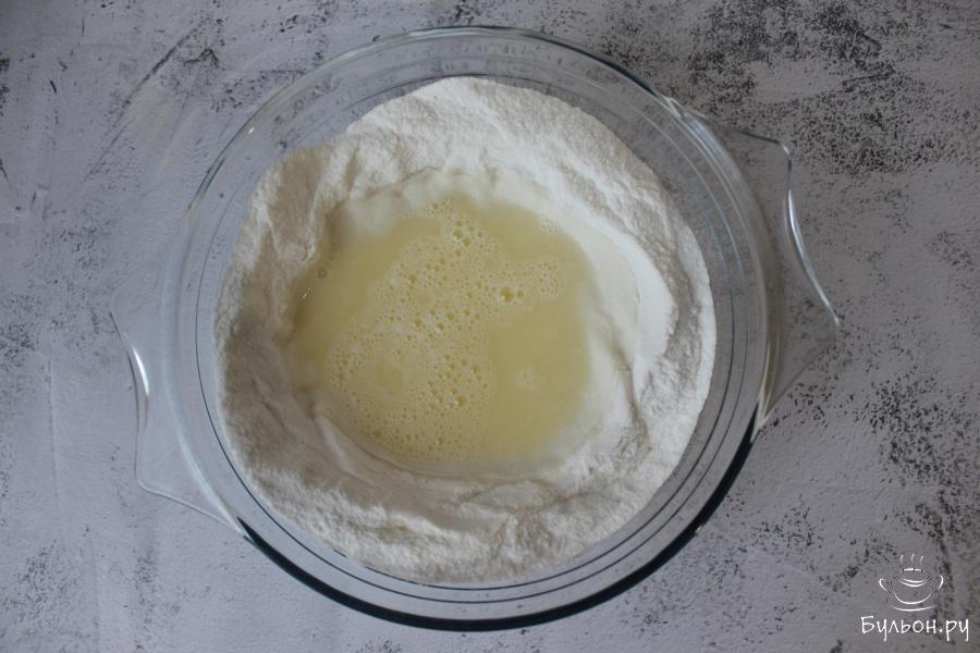 1. Рисовую муку, как и любую другую, сначала просеиваем через сито. Приправляем солью и сахаром. Перемешиваем, чтобы соль и сахар хорошо перемешались с мукой.