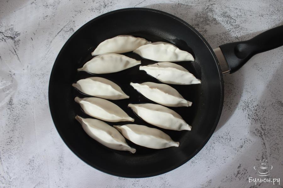 8. Готовим пельмени в стиле гедза, то есть сначала обжариваем их, а затем, влив кипяток (100 мл.), готовим под крышкой 10 минут. Открыв крышку, продолжаем готовить пельмени до полного выпаривания жидкости.
