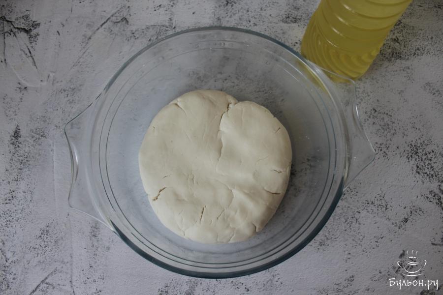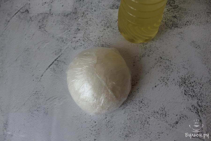 5. Получившиеся комок оборачиваем пленкой, желательно несколько раз. Теперь 20 минут тесто должно полежать в таком виде.