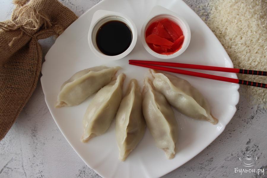 9. Так как пельмени приготовлены в японском стиле, подаем их к столу вместе с соевым соусом и имбирем.