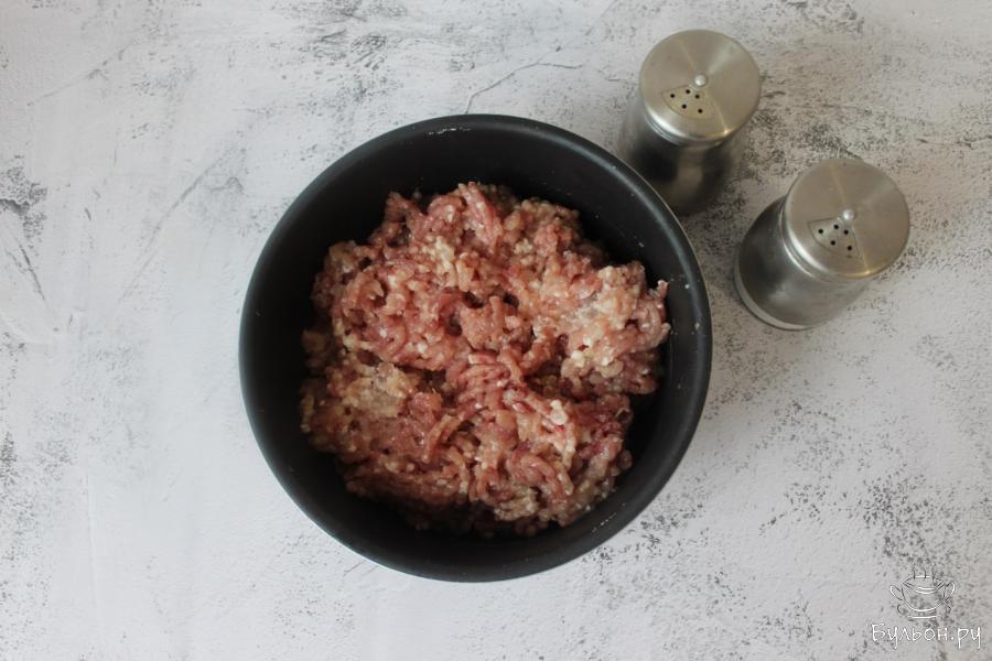 6. Готовим начинку, как на обычные пельмени. Промалываем свинину с луком, добавляем соль и перец по вкусу.