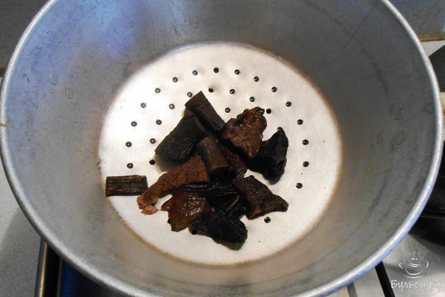2. Отварить грибы в подсоленной воде в течении часа после закипания. Откинуть на дуршлаг, дать стечь воде.
