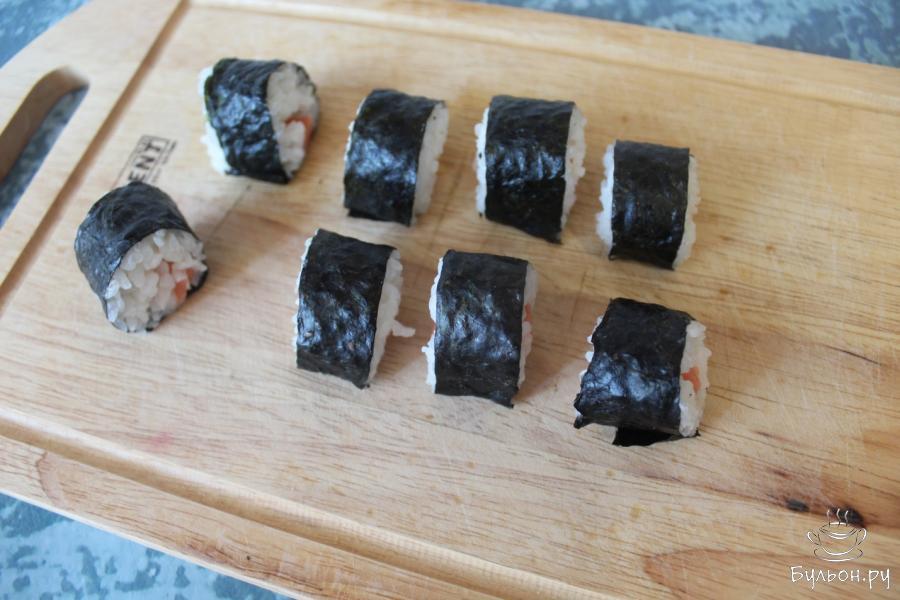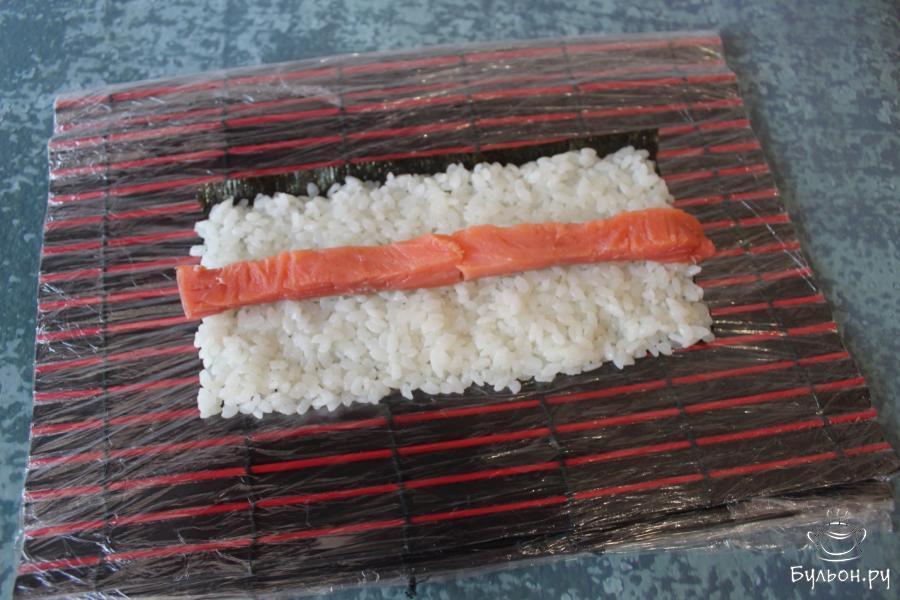 4. Рыбу (лосось слабой соли) очистить от чешуи и косточек, отрезать брусочек около 15 грамм и выложить на рис. Помогая циновкой, свернуть ролл.