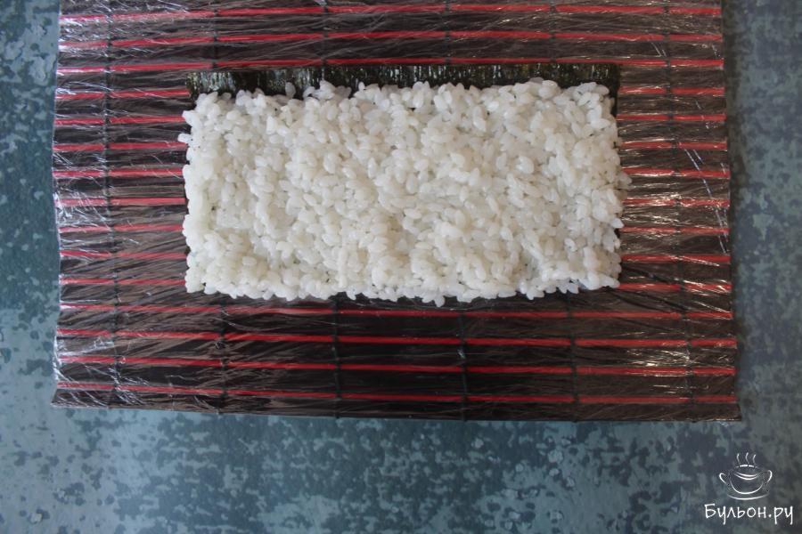 3. Циновку обернуть пленкой. Взять пол-листа нори. На матовую сторону положить 70 грамм отварного риса и тонким слоем распределить по нори, оставив сверху примерно 1 см. свободного края.