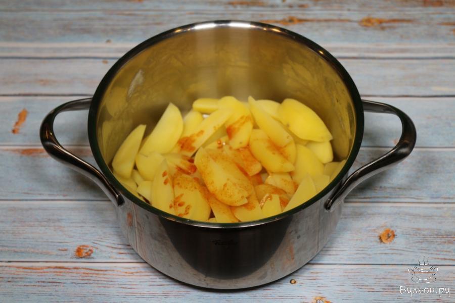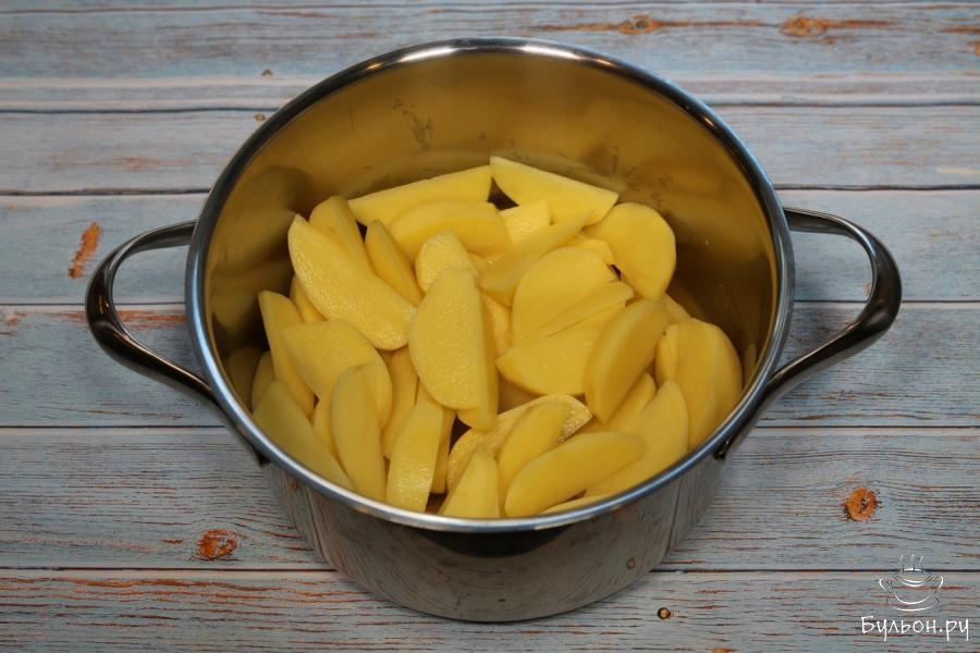 1. Картофель берем среднего размера и чистим от кожуры с помощью овощечистки. Нарезаем его на дольки, разрезав каждую картофелину на 8 одинаковых долек. Кладем их в большую кастрюлю.