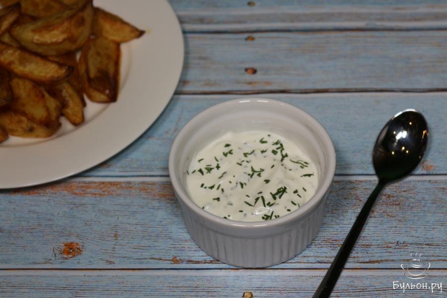 6. Картофель сразу раскладываем по тарелкам и подаем со сметанно-чесночным соусом. В его состав входит сметана, измельченные чеснок и укроп, и немного соли.