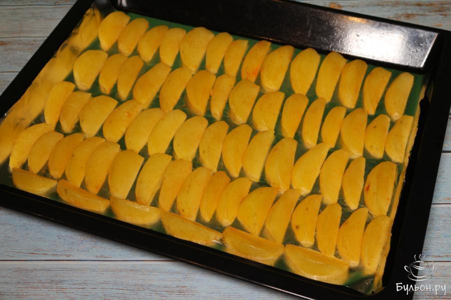 5. Масляный картофель выкладываем на противень. Застеленный фольгой. Ставим его в предварительно разогретую до 220 градусов Цельсия духовку на 30 минут, после чего достаем противень из духовки.