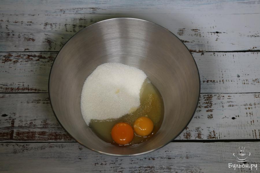 1. В емкость вбиваем 1 яйцо полностью, от второго кладем только желток. В эту емкость также добавляем следующие ингредиенты: мед и сахар. Миксером взбиваем продукты, содержащиеся в емкости, до однородного состояния.
