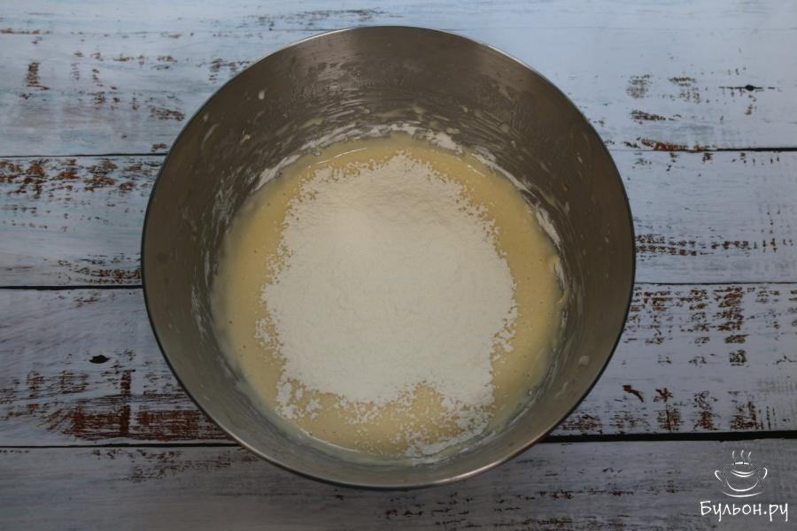 3. В муку добавляем соду, перемешиваем сухие ингредиенты. Эту смесь порционно просеиваем через сито и добавляем в емкость к уже вбитым ингредиентам. Замешиваем таким образом тесто. Если муки окажется мало, то добавляем еще, но следим чтобы тесто осталось достаточно мягким.