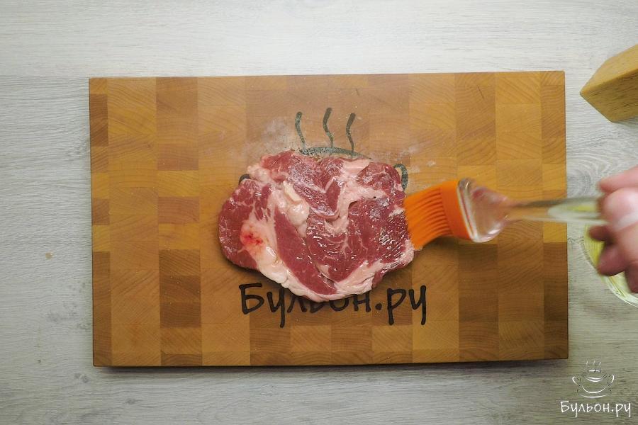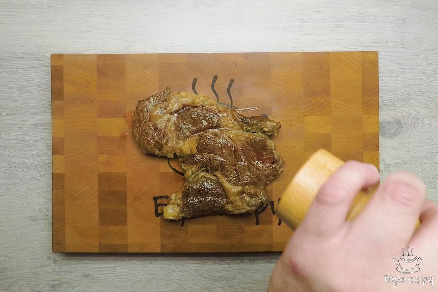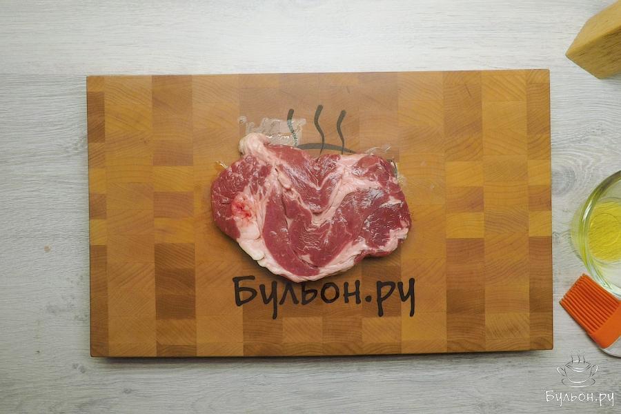 1. Стейк необходимо достать из холодильника и подержать при комнатной температуре примерно 1.5-2 часа, потом открыть упаковку, собрать влагу бумажным полотенцем и дать полежать еще 30 минут.