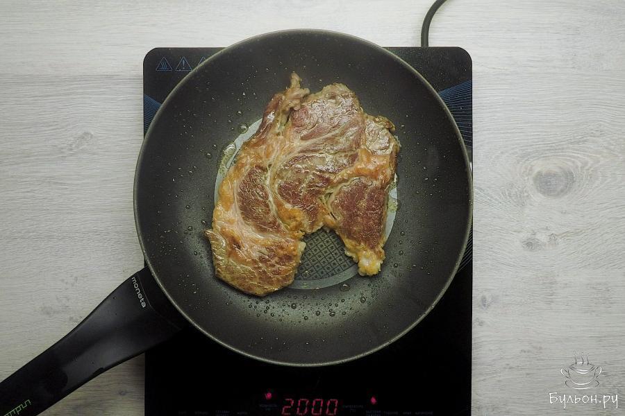 6. Обжариваем стейк на максимальном огне в течение примерно 2 минут, переворачивая каждые 30 секунд.