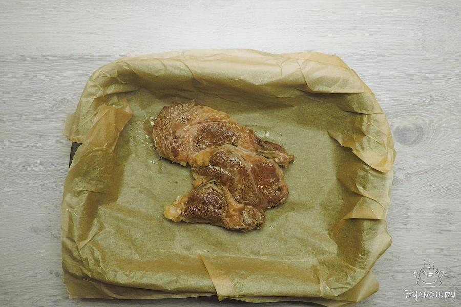 7. Выкладываем мясо на противень и отправляем в духовку, разогретую до 160 градусов, примерно на 5 минут для получения прожарки "medium well".