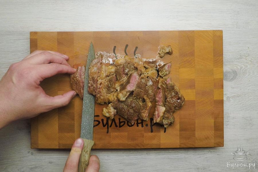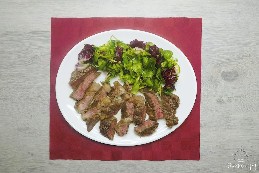 10. Выкладываем кусочки стейка чак ролл на тарелку вместе с салатом. Наивкуснейший стейк готов, приятного аппетита!