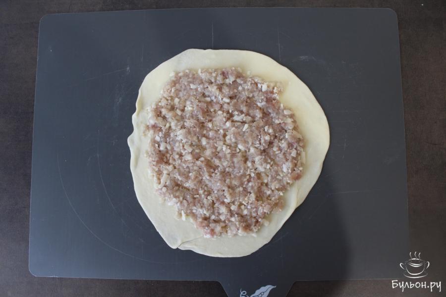 5. Готовое тесто разделить на 10 частей. Взять первый кусочек и с помощью скалки раскатать его в одну лепешку. Выложить мясную начинку и распределить ее по всей лепешки, оставляя немного места по краям.