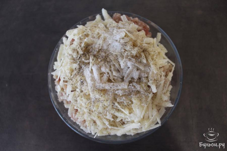 4. Фарш смешать с измельченной через мясорубку луковицей, приправить солью и перцем, добавить натертый на крупной терке сыр. Перемешать.