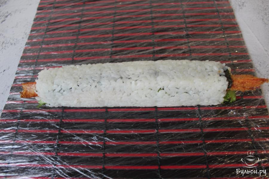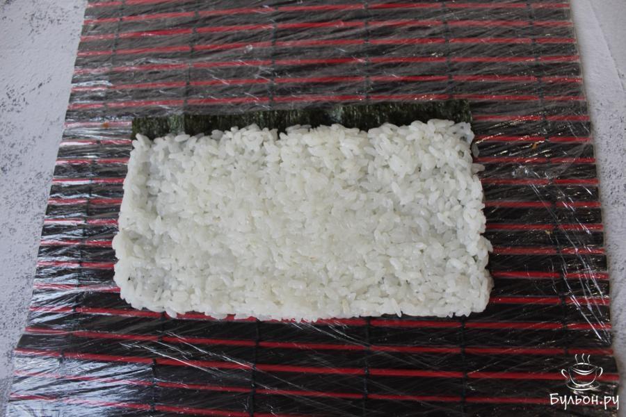 12. Обернутую пленкой макису слегка смажьте растительным маслом. Выложите 1/2 нори шершавкой вверх, обмокните руки в воде с уксусом и возьмите 145 гр. риса. Распределите его по нори, оставив 1 см. сверху свободным от риса и 1 см. риса выступающего за нори.