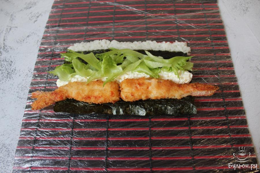 13. Переверните, как показано на фотографии. Отцентровав взглядом нори, выложите сначала творожный сыр, затем темпурированные лангустины и салатные листья.