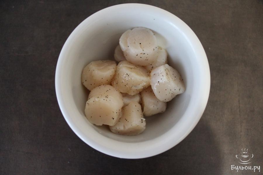 1. Филе заранее размноженных морских гребешков ополосните под водой и промокните бумажными полотенцами. Это позволит убрать лишнюю влагу. Когда филе гребешков немного обсушатся, сбрызгиваем его соком лимона и приправляем специями: солью и перцем. В течение 20 минут гребешки должны замариноваться.