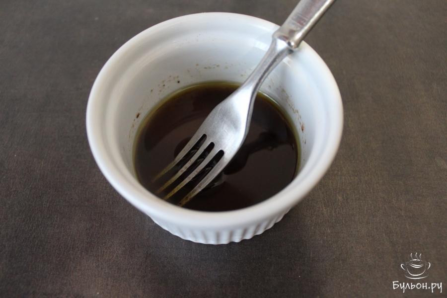 5. В отдельной емкости готовим заправку. Все ингредиенты, входящие в состав заправки: оливковое масло, соус табаско, бальзамический уксус, сахар, черный молотый перец и соль, взбиваем маленьким венчиком.