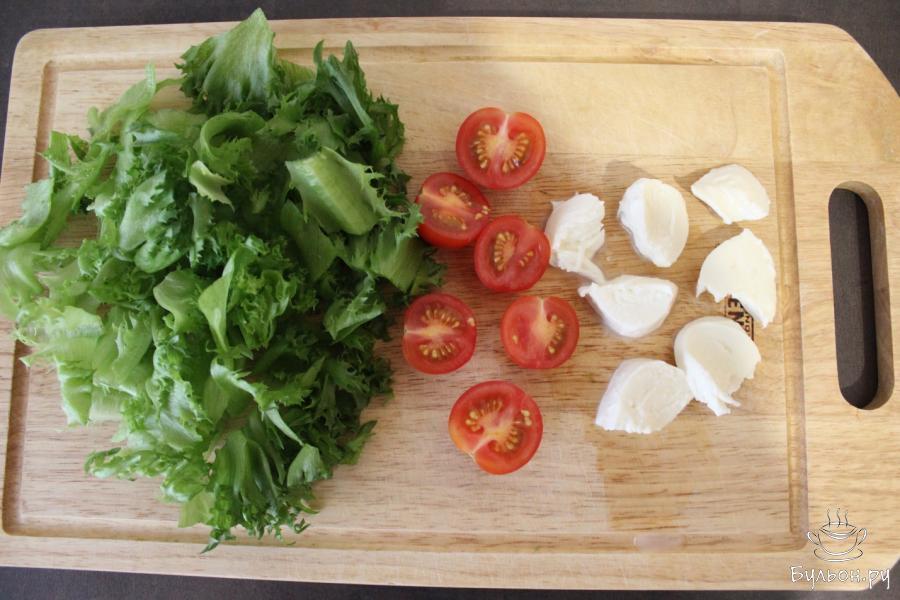 4. Чистые листики салата измельчаем руками, вымытые черри разрезаем пополам. Моцареллу режем произвольно.