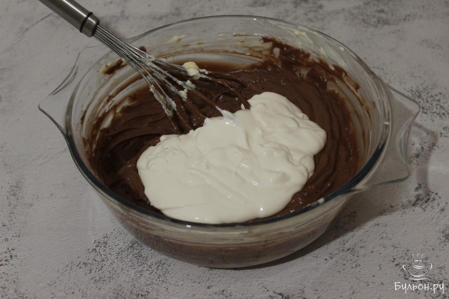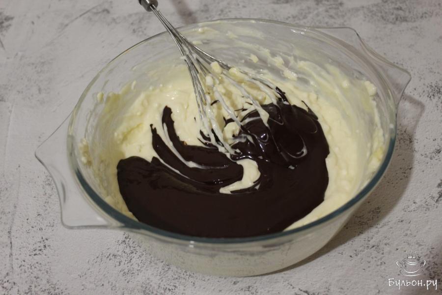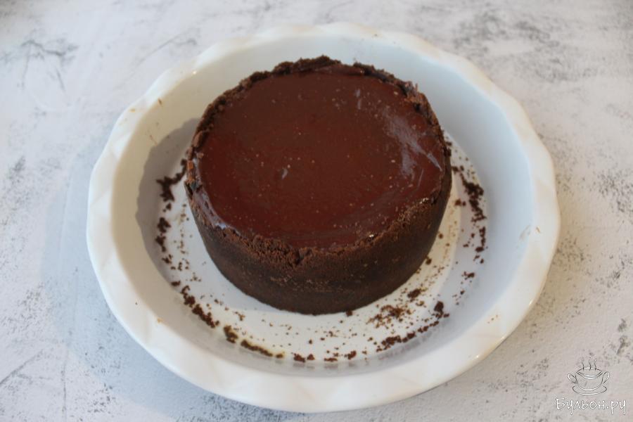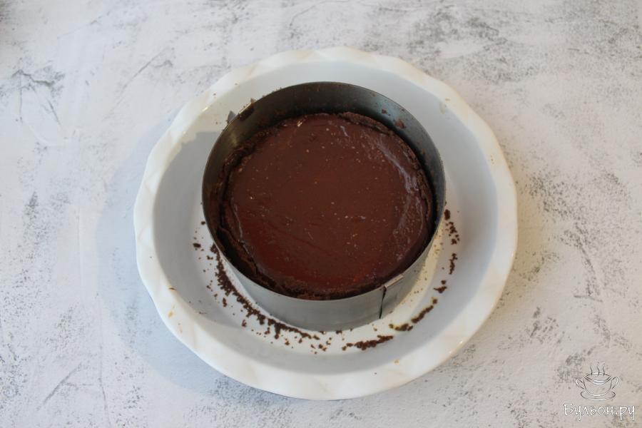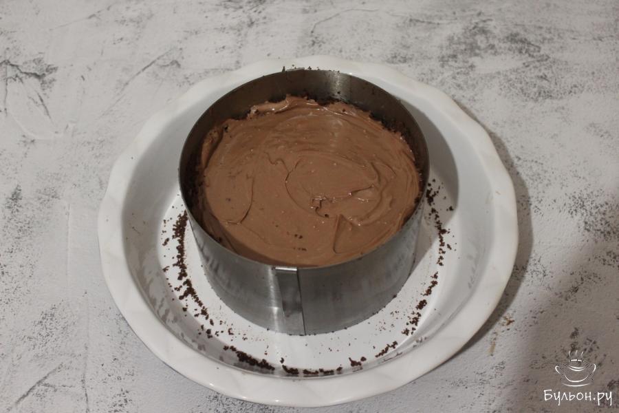 10. Получившуюся шоколадно-сливочно-сырную массу аккуратно перелейте в остывшую песочную основу, слегка встряхните, чтобы разровнять и выпустить пузырьки воздуха из чизкейка.