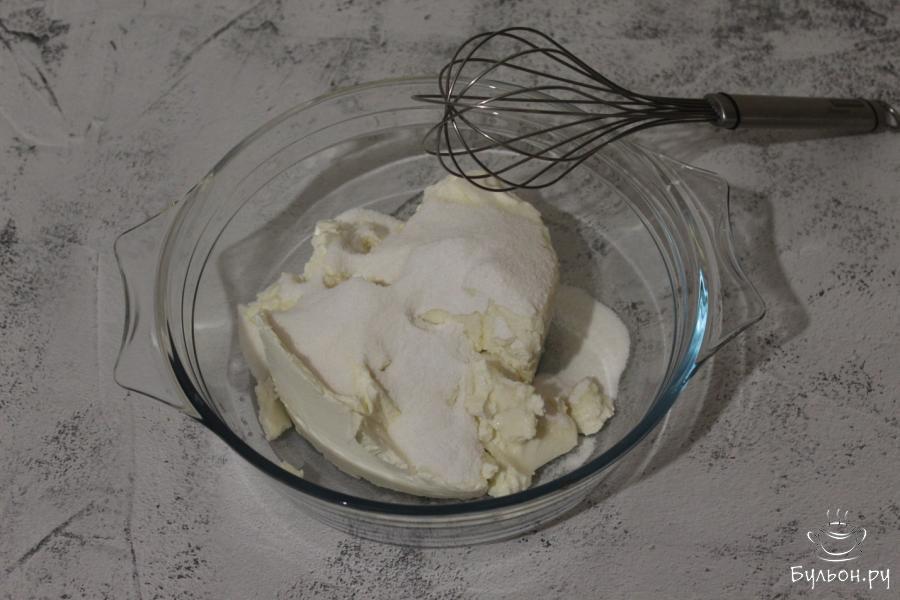 6. Сливочный сыр переложите в глубокую емкость, всыпьте просеянную пудру. Пудру лучше просеять, чтобы исключить попадания сахарных комочков. С помощью взбивания массы венчиком соедините ингредиенты.
