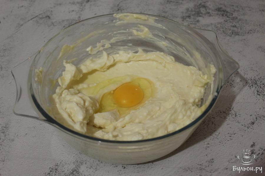 7. В получившуюся сырную массу поочередно введите куриные яйца категории С1, каждый раз тщательно вымешивая массу венчиком.