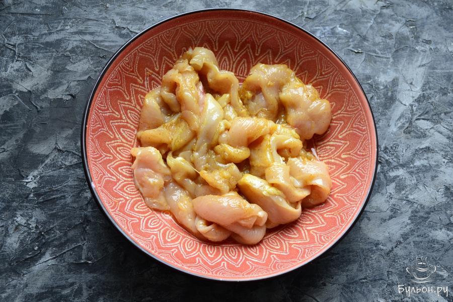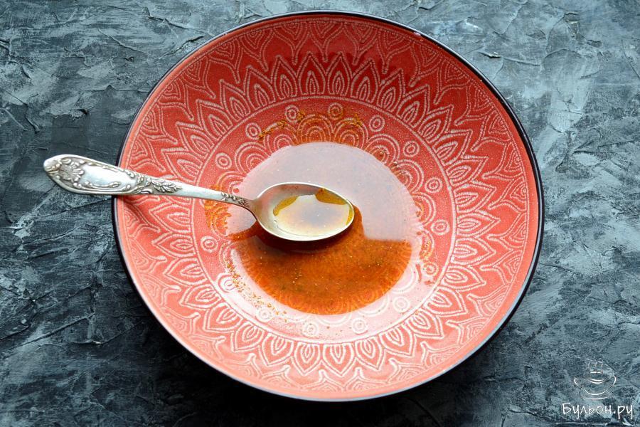 2. В глубокой посуде, подходящей для готовки в СВЧ смешать растительное масло с приправой карри, отправить для нагрева в микроволновку на 1 минуту с мощностью 750 Вт.