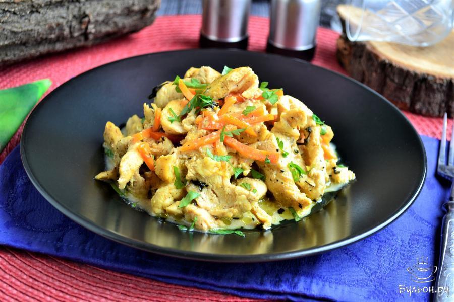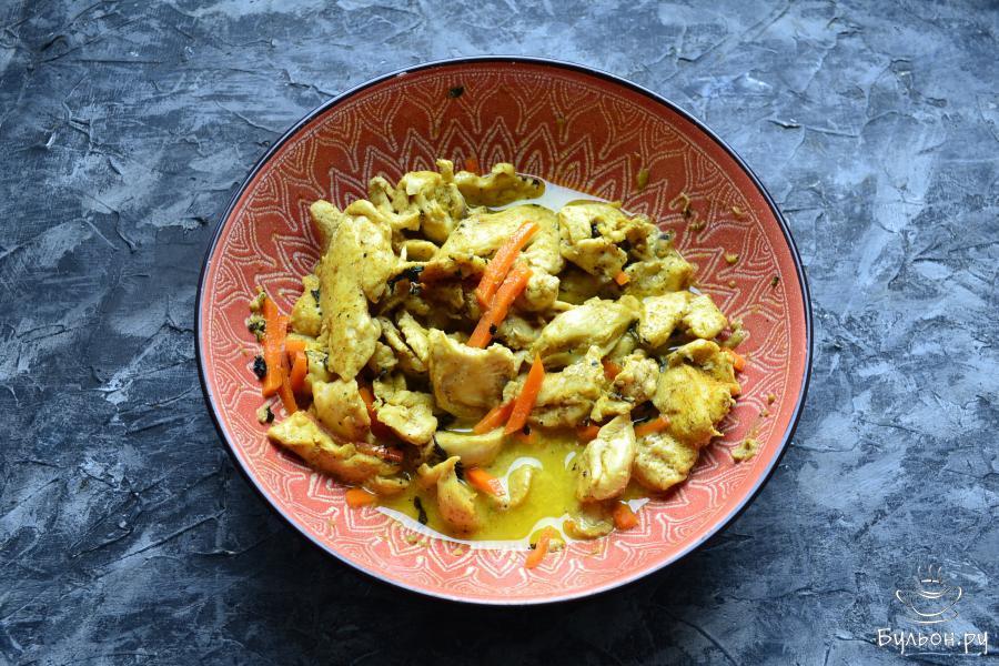 Многие считают, что это блюдо принадлежит индийской или другой восточной кухне, но это совсем не так. "Карри" - в переводе с языка Южной Индии обозначает "соус", т. е. курица, овощи, рыба и т. п., приготовленное в любом пряном соусе может называться блюдом "карри". Самое интересное, что придумали все это британцы, а вот в Индии о таком блюде даже и не слышали. В любом случае, карри из курицы получается очень вкусным, сочным и ароматным. Предлагаю вам приготовить это блюдо в микроволновой печи, что займет существенно меньше времени. Подать карри из курицы можно с отварным рисом, толченым картофелем или любой кашей. Молоко лучше взять жирное или заменить его на сливки.