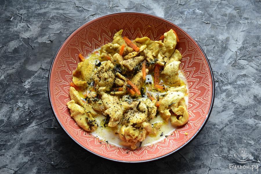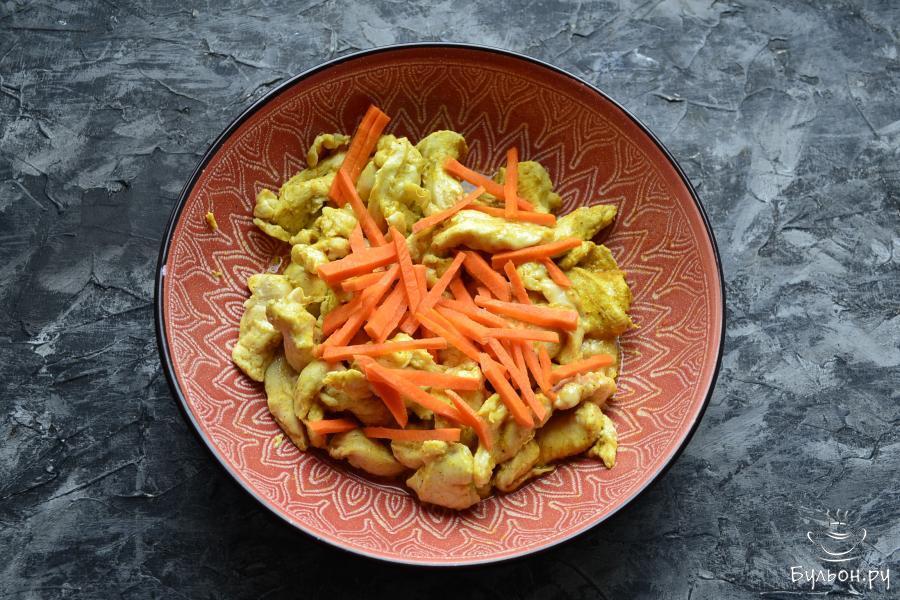 4. Отправить курицу в СВЧ при той же мощности на 3 минуты, накрыв крышкой, перемешать, после чего добавить порезанную соломкой морковку.