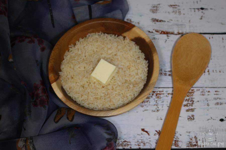 7. После чего достаем чашу из пароварки. Готовый рис подсаливаем, добавляем кусочек сливочного масла. Перемешиваем и раскладываем по тарелкам.